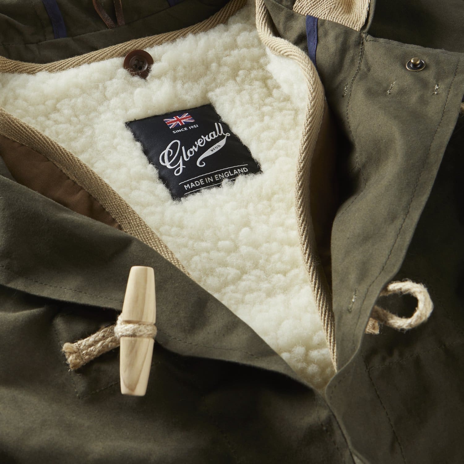 Inside, there is a fully detachable wool shearling vest. This versatile feature can be buttoned in for extra warmth during the colder weather and removed on milder days to reveal the fully bound seams and herringbone tape finishing.Design Details